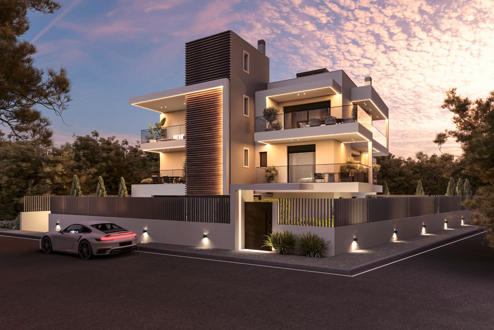Ο αρχιτεκτονικός σχεδιασμός ακολουθεί αρχές καθαρότητας, διακριτικής πολυτέλειας και λειτουργικής αυτονομίας. Οι κατοικίες οργανώνονται με τέτοιο τρόπο ώστε να διασφαλίζεται πλήρης ανεξαρτησία μεταξύ τους, χωρίς κοινόχρηστους χώρους, προσφέροντας ιδιωτικότητα σε επίπεδο πρόσβασης, χρήσης και θέασης. Δύο κατοικίες καταλαμβάνουν το ισόγειο και τον πρώτο όροφο, η καθεμία με αποκλειστική χρήση κήπου και πισίνας, ενώ η τρίτη βρίσκεται στο δεύτερο επίπεδο και διαθέτει ιδιωτικό roof garden με ανεμπόδιστη πανοραμική θέα.